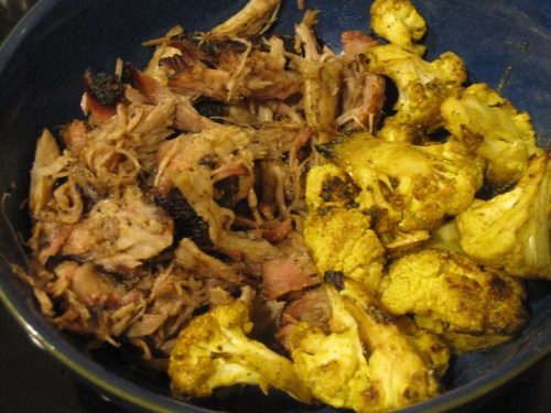 We put the pork in a bowl with some cauliflower and ate some plain and ate some with a bit of BBQ sauce.