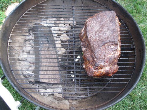 Because the temperature was close enough to what I had wanted it to be and it was getting late, I took the meat off after about 4.5 hours of total cooking time.  This method also uses the fuel very efficiently as the coals could have gone for another few hours.