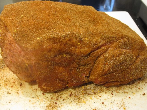 The rub was just a combination of some dried spices and whole peppercorns that I ground in our spice grinder.  It was very loud at first and I ran it until itwas quieter but not fully ground.  I wanted to keep the peppercorns a bit coarse.