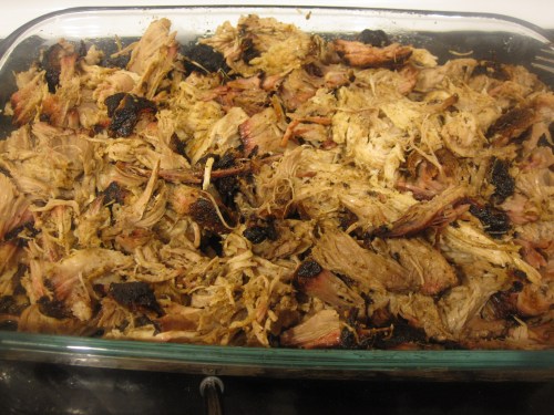 Once the pork was cool enough to handle, I shredded it with two large forks which was pretty easy except for a bit around the bone as mentioned.  The smoky flavor and rub had really penetrated throughout and there were pockets of stronger garlic flavor than others which I considered prizes.