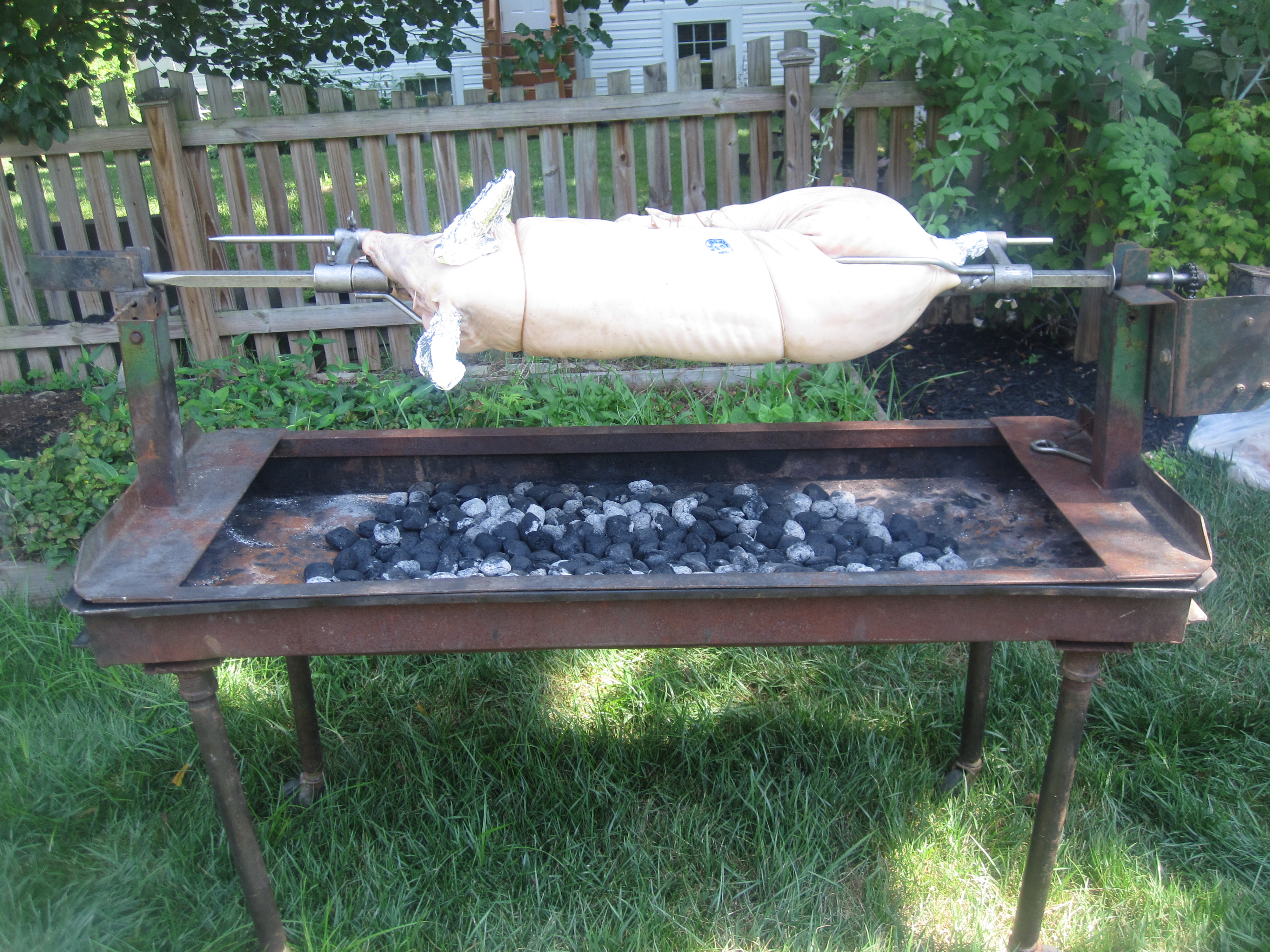 The rented spit was well experienced but did a great job once we messed around with it, formed it into shape, and got the right tension on the chain to the motor.