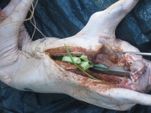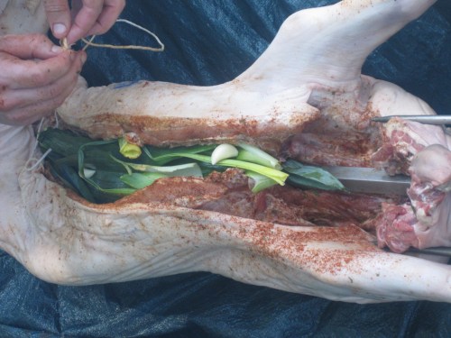 The pig weighed about 49 pounds and came pre gutted and basically all prepped for us.  We added some seasoning and filled the cavity with onions, garlic and leeks.  Then the pig had to be skewered and sewn up to keep the filling in.