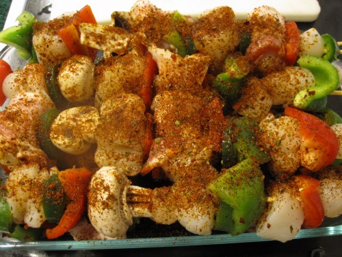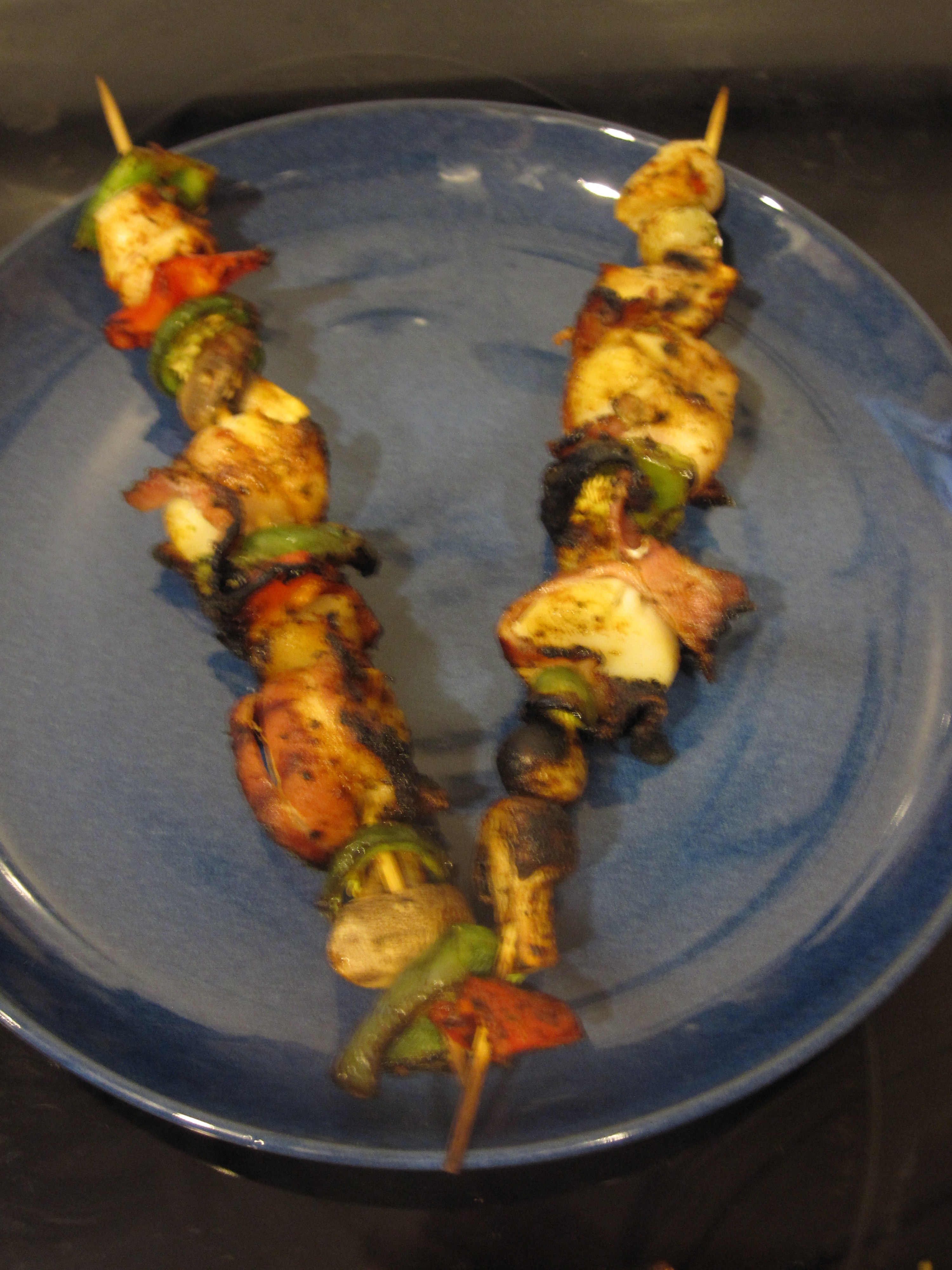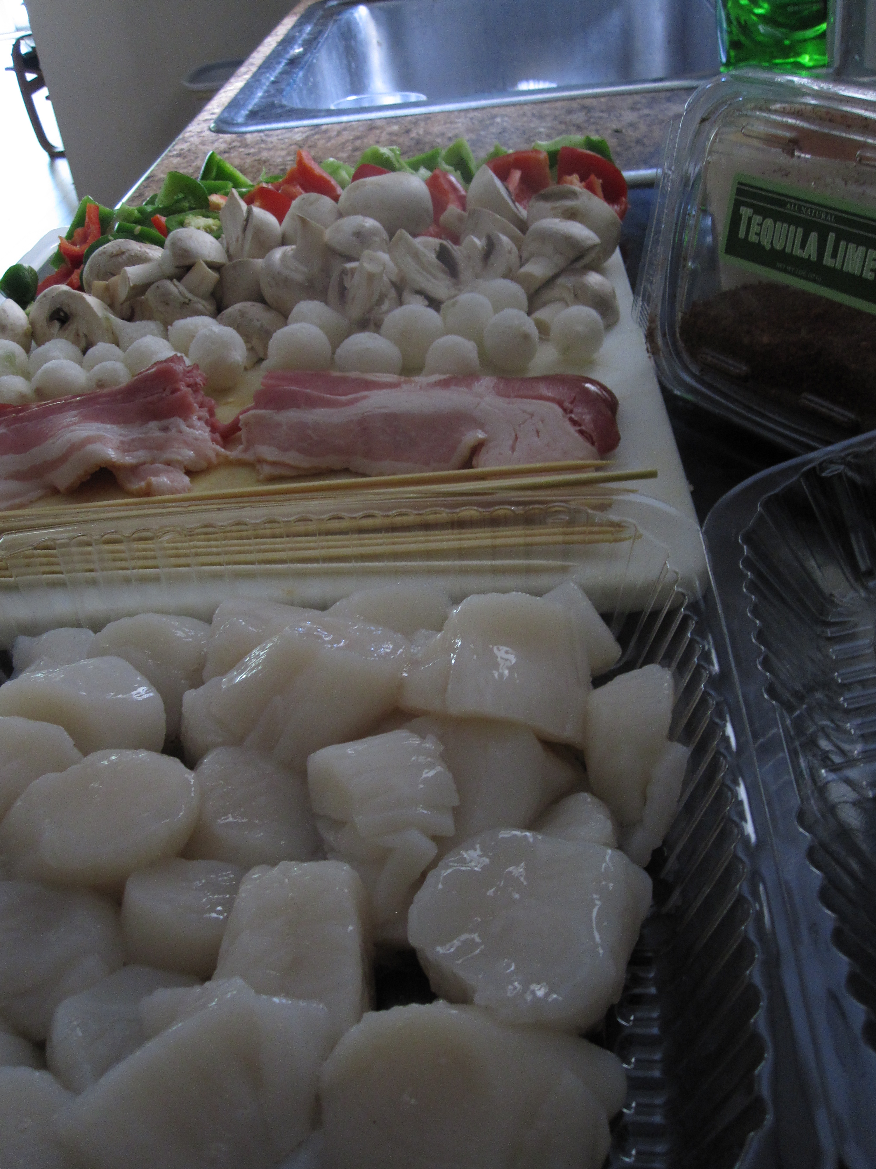 I decided to use a standard array of skewer vegetables, but also decided to fall upon the cliche garnish of bacon wrapping some of the scallops.