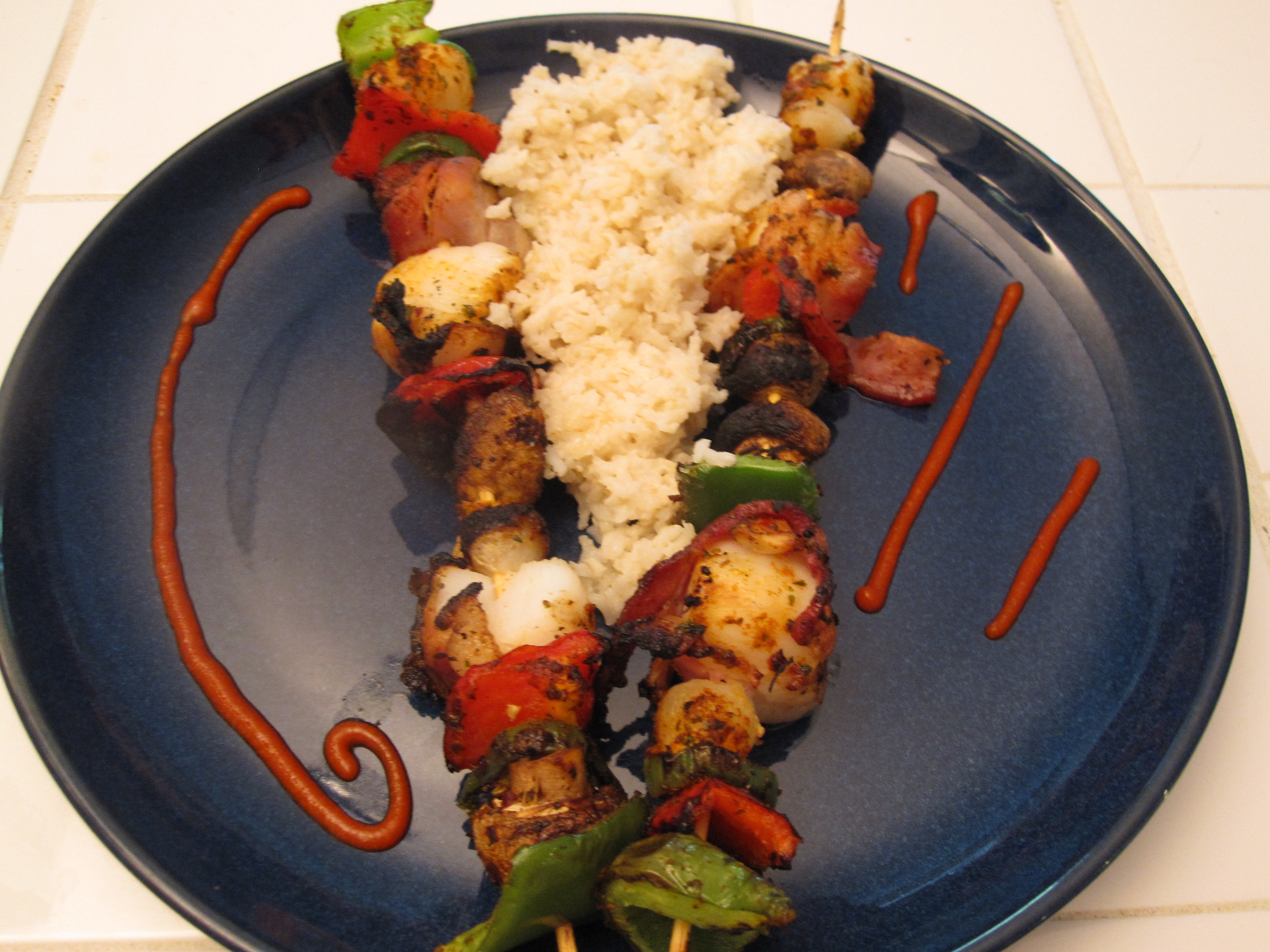 And the completed dish with brown rice and some siracha on the side. We pulled everything off of the skewers and placed it upon the rice. As mentioned, with the jalapenos the siracha was not called upon much, though I use it on many dishes. Overall, this dish was great and I recommend it as a good way to grill scallops, keep the summer cooking to the outside heat, and bring some summery grilled veggies into the mix.