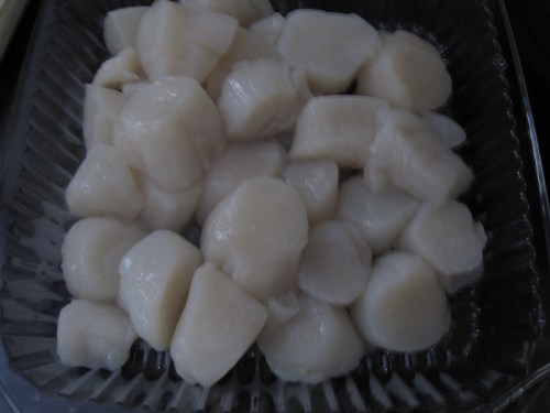 Scallops were on a great sale at Giant, $7.99 a pound for sea scallops down from the usual $10-$11 or even more so I got some but did not have a vision of what I was going to do with them. As you will notice we are big grillers, and being that it has been so hot recently I have been trying to keep most of the cooking to outside which led to grilling. I have tried to grill scallops right on the grill grate before, but that was a wasteful disaster. I have also grilled them in the grill basket, but it was not great. The only other grilling possibility seemed to be skewering, which I had never tried with scallops but was hopeful.