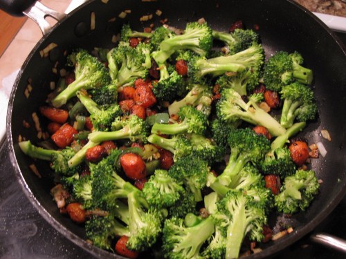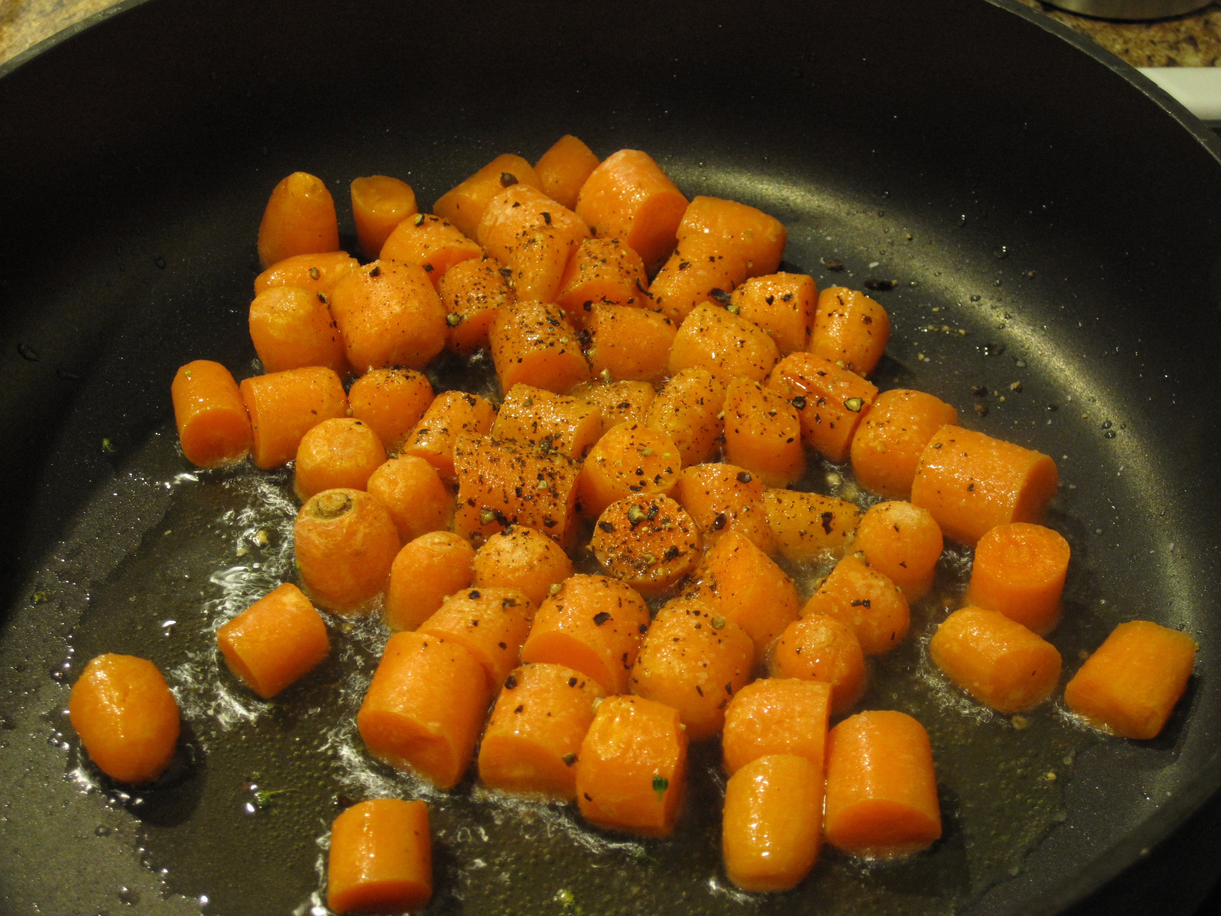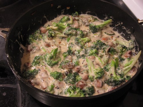 Interestingly, Greg and I cooked in a rather unusual fashion for us for this meal. I was responsible for one thing and he the other. I had a vision for the fish that didn’t match his so I took over on that. He focused on the veggie side dish, which was pretty amazing! He started off by sauteing some carrots, onions, and broccoli and then made a decadent cream sauce to pour over top.
