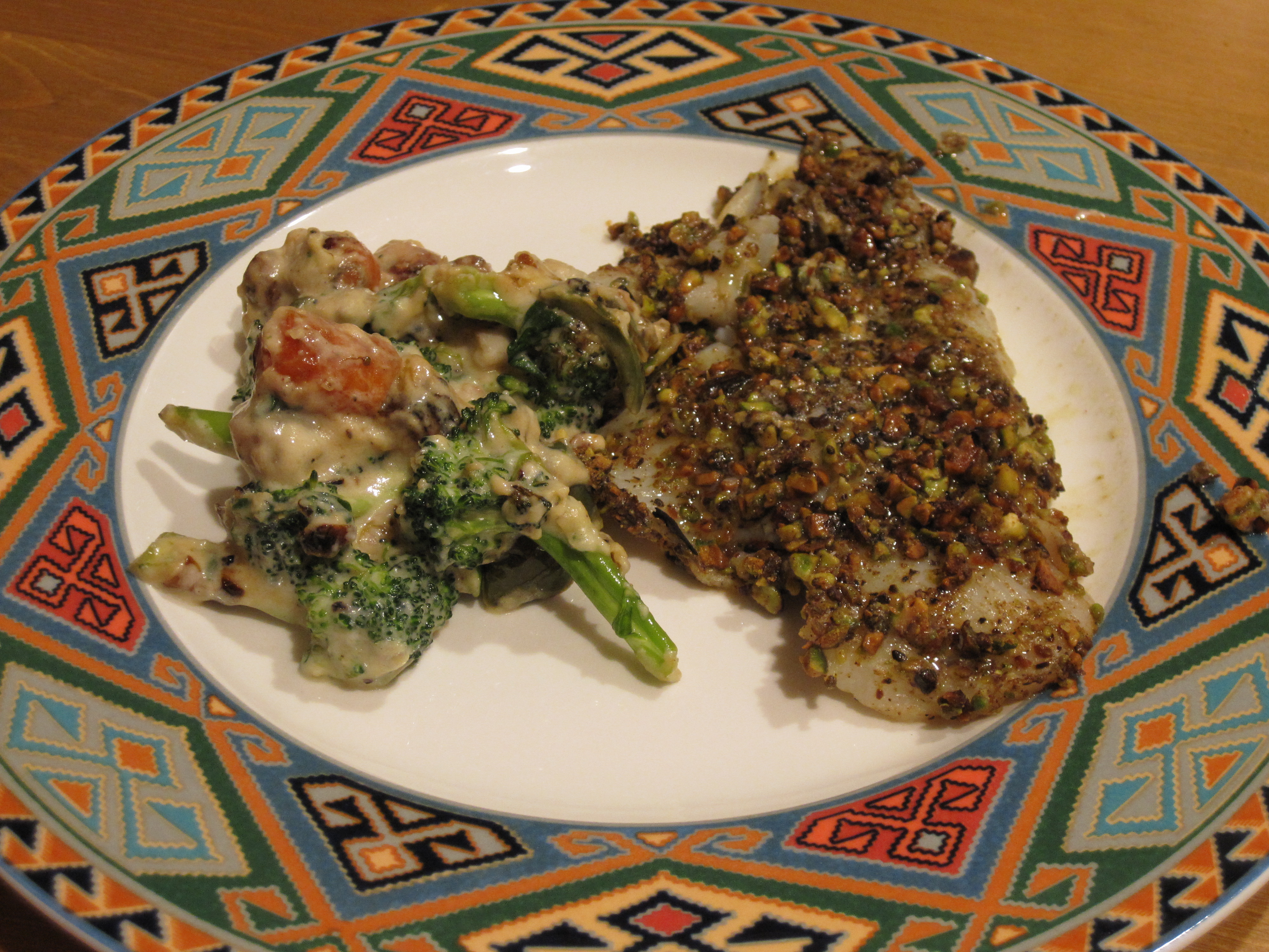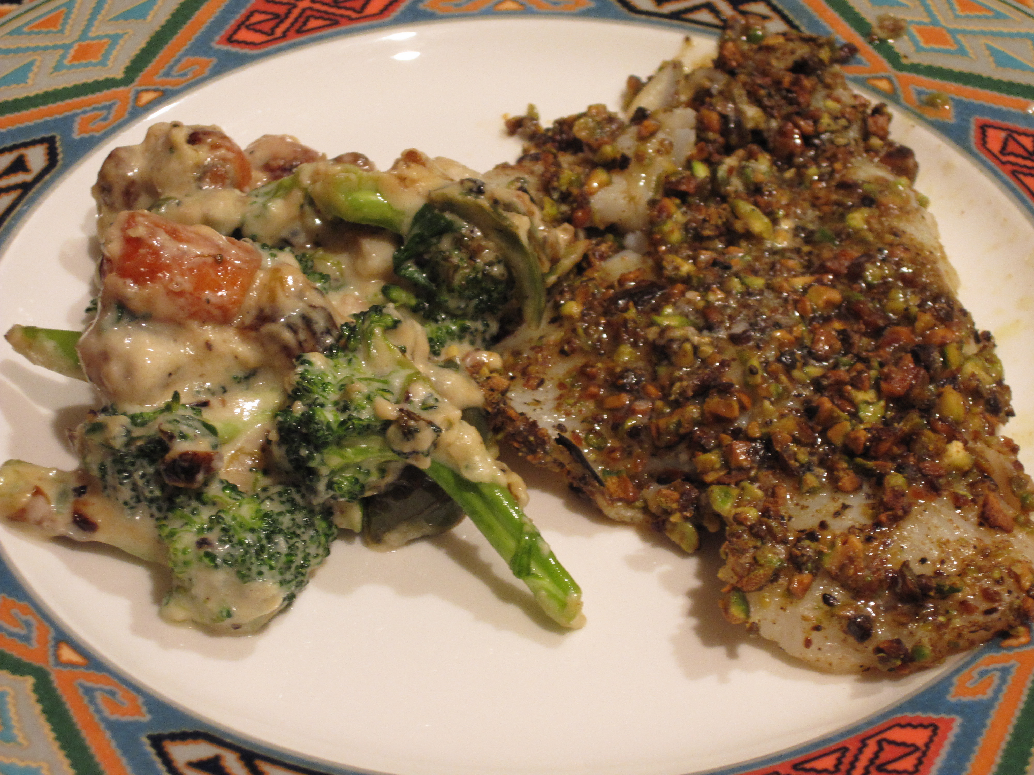 The flavors of this meal were very rich and decadent. A little went a long way here and it was very filling for being a fish and veggies dinner. The pistachio crust still needs a little perfecting, but I was intrigued by the prospects. I may incorporate some almond flour to make it more breaded than coated next time. We’ll see…