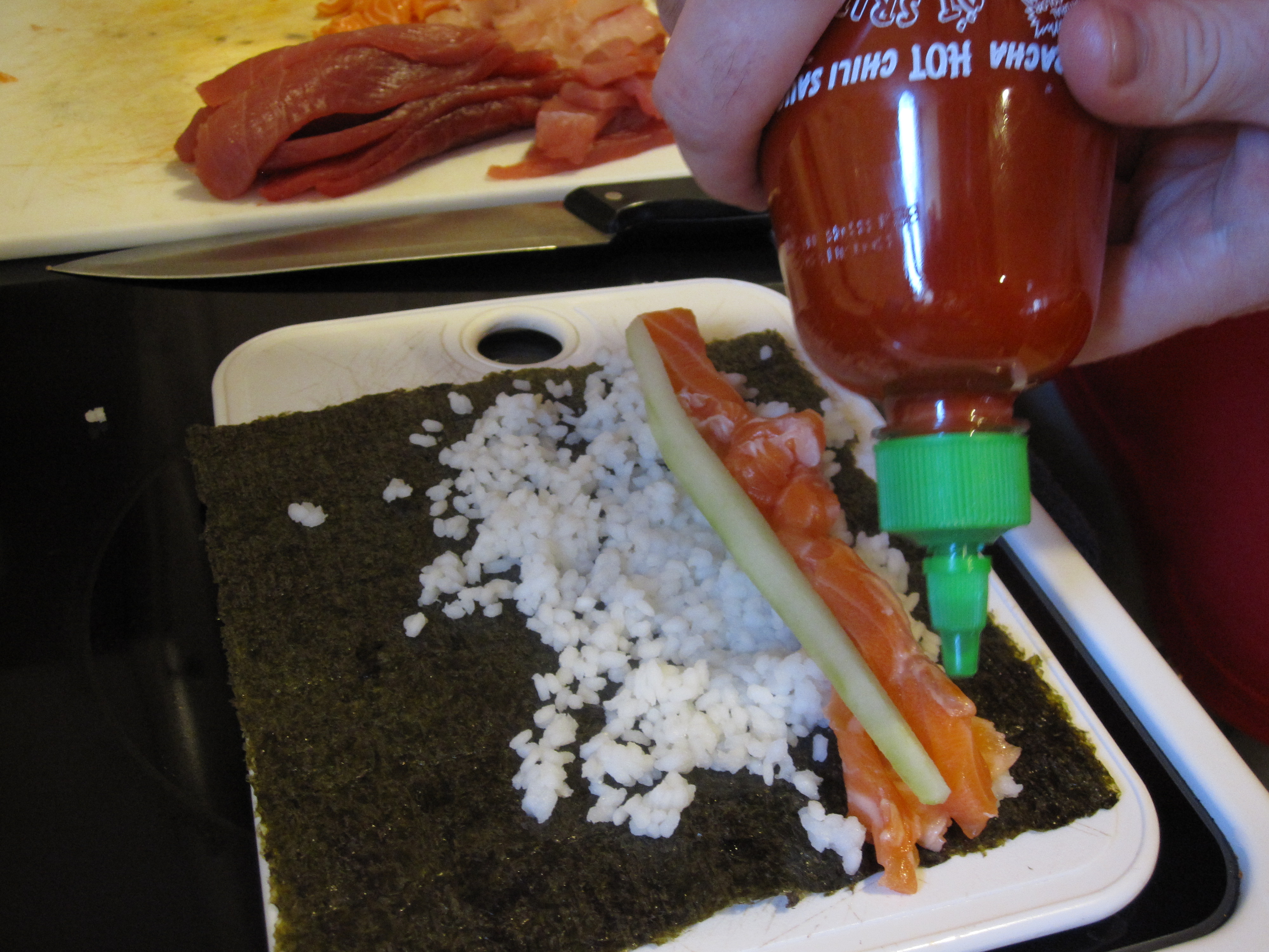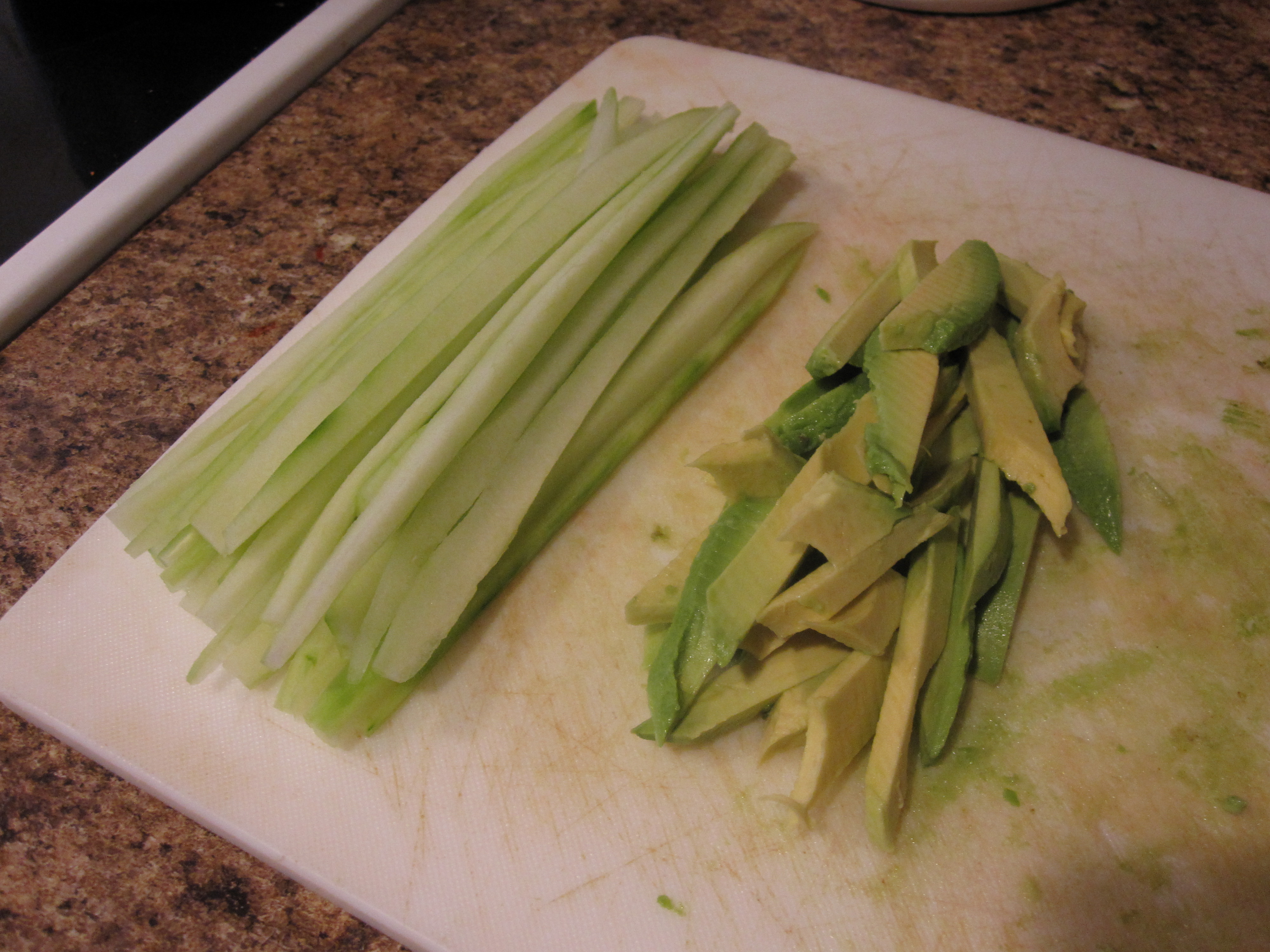 Everything needed to be cut down to size for the rolls. We sliced up the fish and also the cucumber and avocado that would go in many of the rolls.