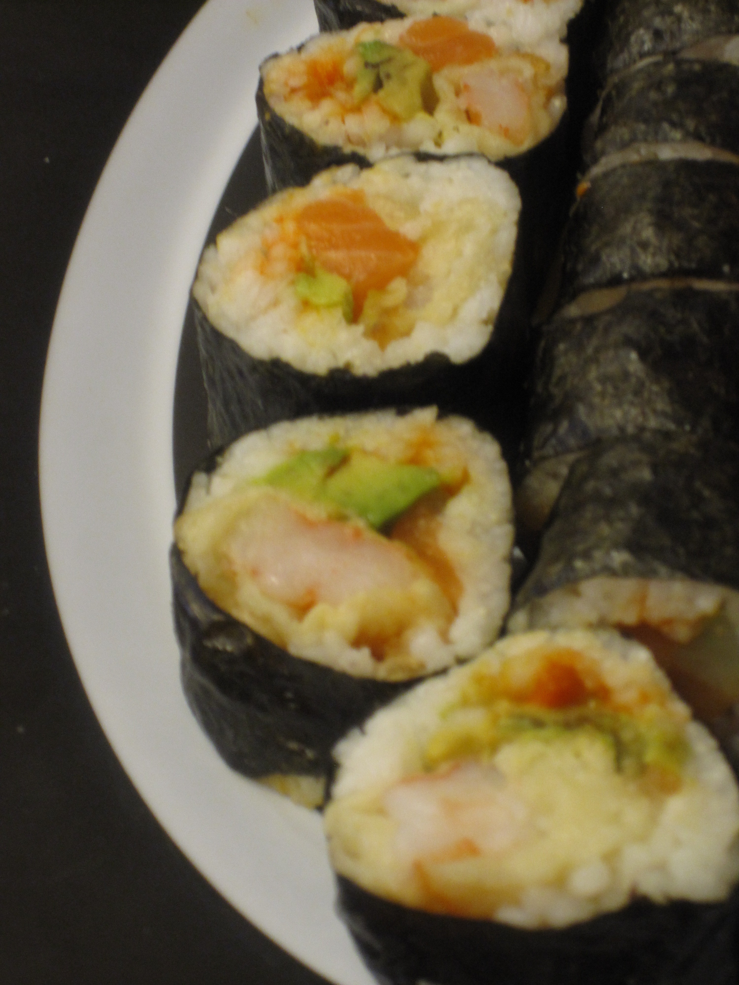 I could not get the camera in focus for these close-ups because I am clueless when it comes to cameras, but I wanted you to see the shrimp tempura roll (front) and the salmon roll behind it.
